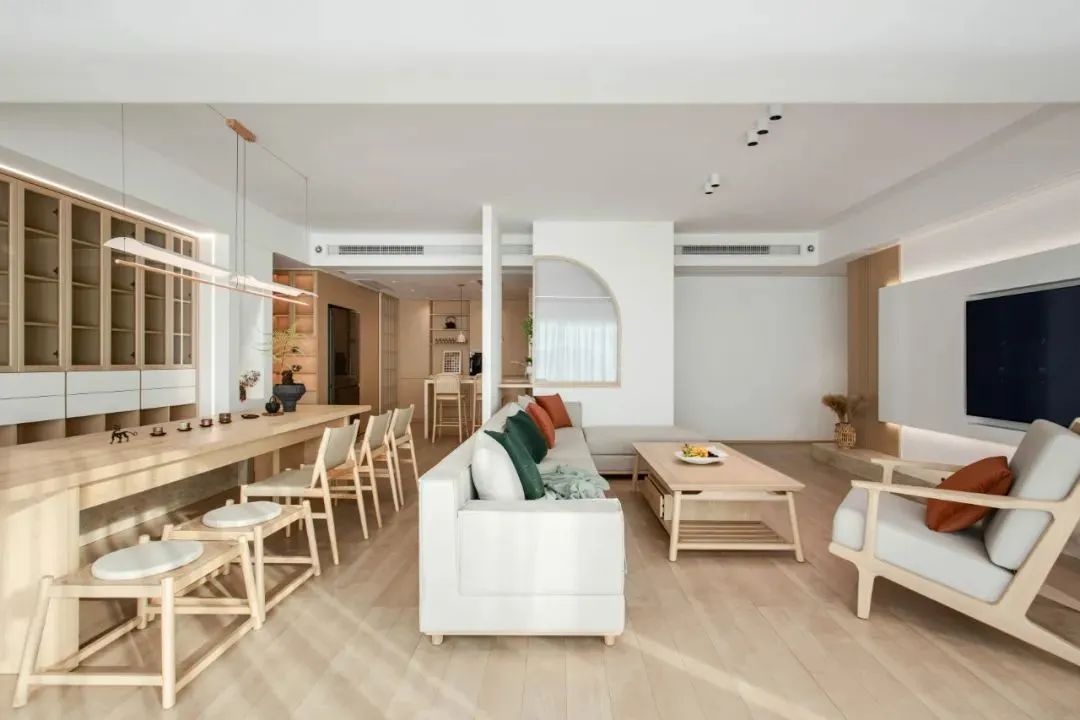玄關(guān)的隔墻用作了走道、客廳、餐廳的核心分隔點(diǎn)。客餐廳有互動(dòng)也有區(qū)隔。